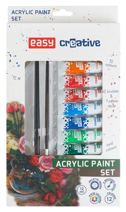 Akrylové barvy 12 barev v sadě + paleta, 2 štětce Easy