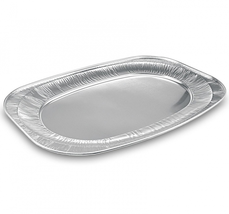 Aluminiové oválné podnosy pro jednorázové použití při občerstvení.
