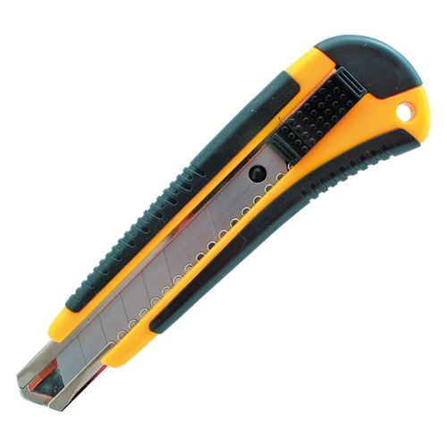 Velký ořezávací nůž s vysouvací čepelí šírky 18 mm s gumovou rukovětí.