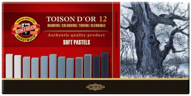 Sada suchých uměleckých prašných pastelů Toison D'or od výrobce Koh-i-noor mají vynikající kreslící vlastnosti a světlostálost. Jsou používány pro tenčí a obrysové linie. Jako plnivo se používá mletá pemza.