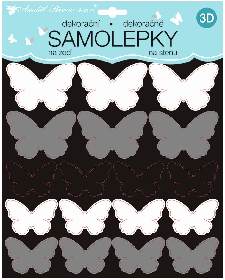 Samolepky na zeď 3D černostříbrní motýli 2 archy 35 ks 25x16 cm+25x25cmSkladem do 7 dní35 Kč/ ks29 Kč bez DPH