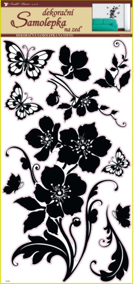 Samolepky na zeď květina s motýly černá, 60x32cm