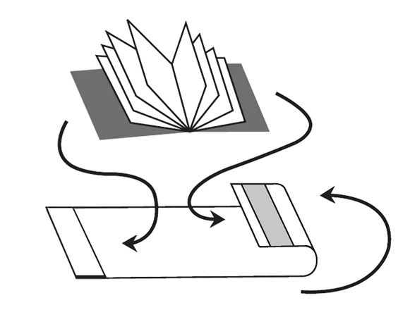 Na levé straně obalu je normální záložka. Do ní vložte levou desku knihy. Na pravé straně, která přesahuje přes pravou desku knihy je stejně široká páska 1 cm od kraje obalu. Pásku přehněte směrem doleva a do vzniklé kapsy vložte pravou desku knihy. Přitáhněte kapsu směrem ke středu vazby. Nakonec obal zarýhněte na pravé straně aby pevně držel. K volbě univerzálního obalu tedy díky posuvné šířce potřebujete znát pouze výšku knihy.