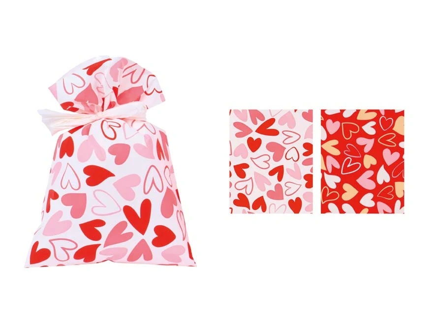 Dárkový sáček v bílé a červené barev s motivem srdíček. Sáček je vyrobený z pevného a kvalitního materiálu. Skvělý na zabalení drobných dárků. Sáček můžete uzavřít vázací stuhou a tím ho dozdobit. V naší nabídce naleznete velký výběr stužek a rozetek, které Vám pomohou při dekoraci balíčku.